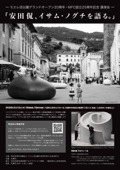 モエレ沼公園グランドオープン20周年ならびに、特定非営利活動法人モエレ沼公園の活用を考える会(モエレ・ファン・クラブ、以下、MFC)設立25周年を記念し、彫刻家・安田侃(やすだ かん)氏による講演会「安田侃、イサム・ノグチを語る」が開催されます。