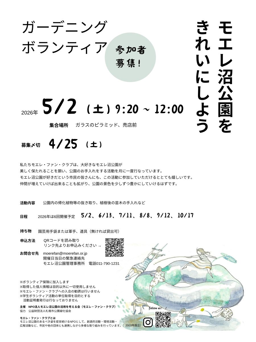 モエレ沼公園で活動しているモエレ・ファン・クラブでは、5月2日に今年1回目となる公園のお手入れ活動(帰化植物の抜き取り、レストラン前ガーデンの手入れや植え替え)を実施します。2026年は5月2日以降、6月13日、7月11日、8月8日、9月12日、10月17日、全て土曜日、9:20〜12:00の活動を予定しています。みなさまぜひご参加ください。